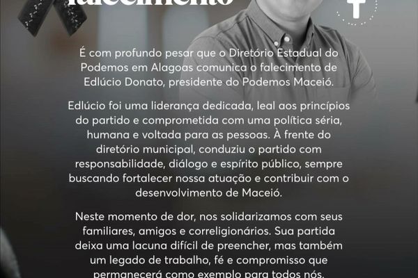 O estado de Alagoas está em luto após a morte de Edlúcio Donato, presidente do Podemos em Maceió. O político, conhecido por sua atuação na esfera local, foi uma figura importante na política alagoana e sua partida gerou reações de pesar entre colegas e autoridades.